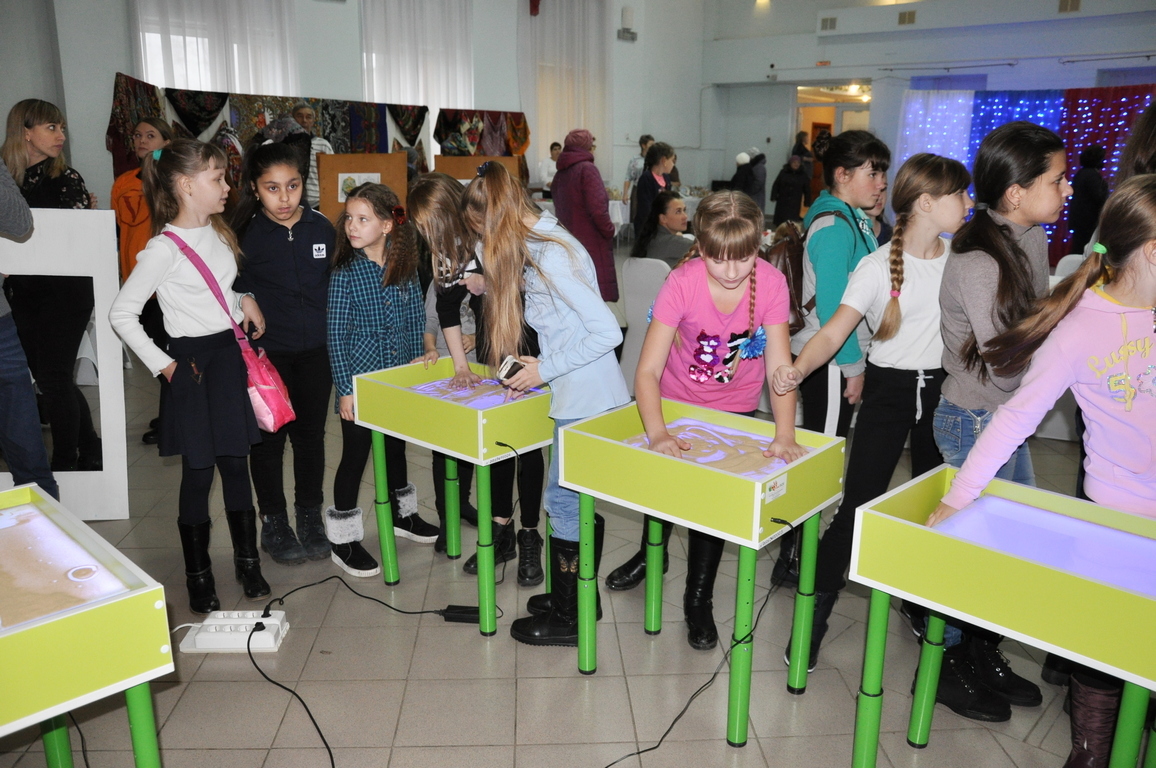 Биоэнергетики утверждают, что столь тесное общение с песком очищает энергетику, стабилизирует эмоциональное состояние, помогает расслабиться и снять стресс. Поэтому рисование песком – занятие не просто увлекательное! Вы верите в чудеса? А в то, что сами можете быть волшебниками? Это возможно с помощью, казалось бы, обычных предметов, которые тоже могут стать волшебными. И у гостей мероприятия была такая возможность стать художниками-чародеями, которые создают поистине необычные картины. И дети, и взрослые с любопытством и интересом подходили к столам и пытались рисовать песком.