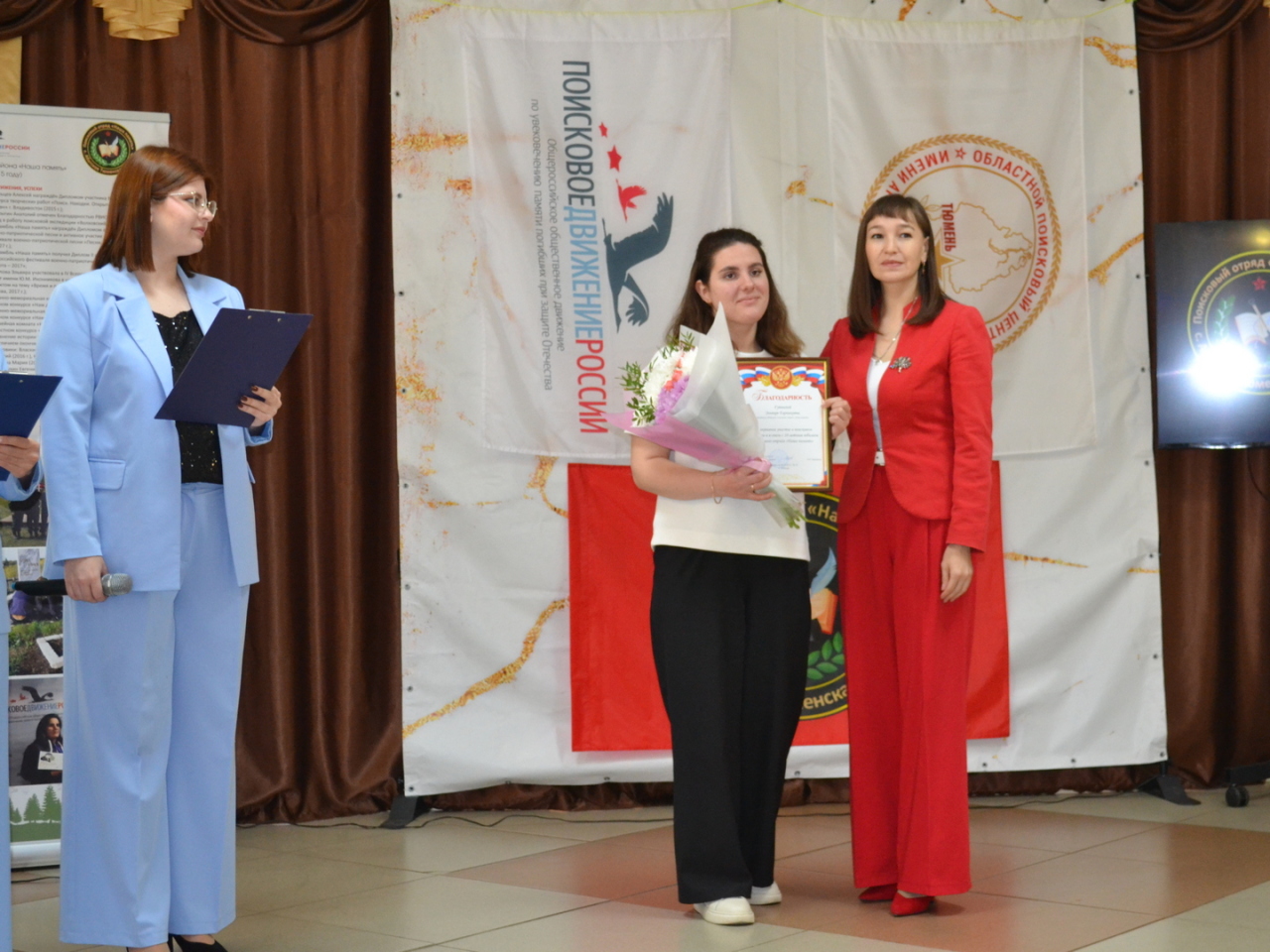 Благодарность отдела по делам культуры, молодёжи и спорта Абатского муниципального района за активное участие в поисковом движении и нагрудный знак "10 лет поисковому отряду "Наша память" вручены Людмиле Голиковой, Эльвире Гутвиной, Наталии Хаповой.