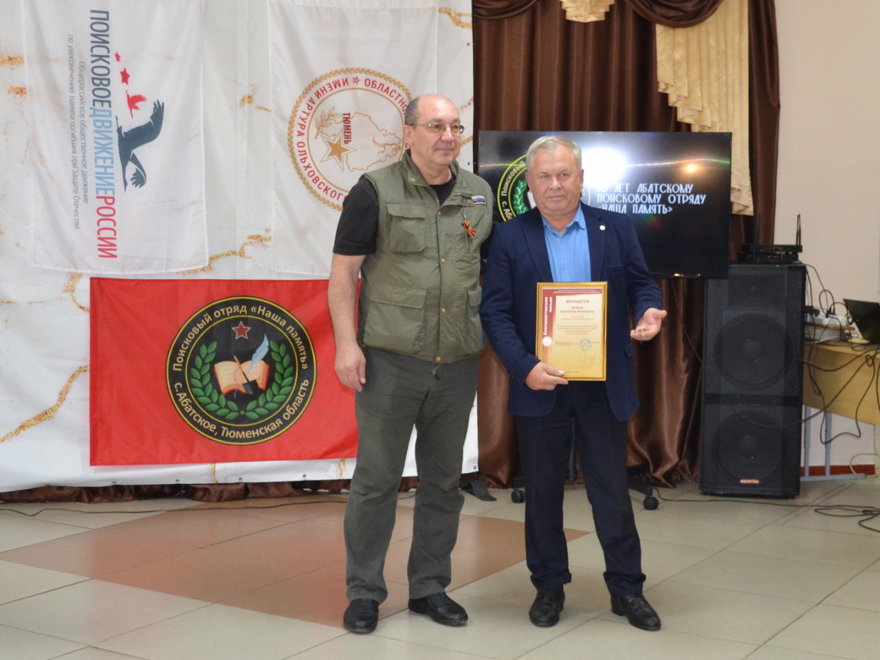 Благодарность МАУ "Молодёжный информационно-деловой центр" Абатского района и нагрудный знак "10 лет поисковому отряду "Наша память" вручены Оксане Головановой, Елене Дёминой, Светлане Колмаковой, Юлии Леонтьевой, Вере Шарниной, Алле Шиховой, а также спонсорам Ирине Арсентьевой, Ольге Болдыревой, Сергею Гончару, Марине Коноваловой, Алексею Плотницкому, Николаю Портнягину, Михаилу Усольцеву.