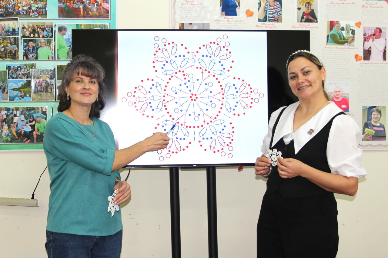 Началось занятие с рассказа Светланы Поздеевой об истории возникновения вязания крючком и русских народных традициях. Рассказ сопровождался стихами и загадками, описанием интересных случаев и фактов. В творческом процессе за рабочим столом участницы проекта делились опытом вывязывания отдельных элементов снежинки, внимательно слушали пояснения руководителей Алёны Вьюховой и Светланы Поздеевой.