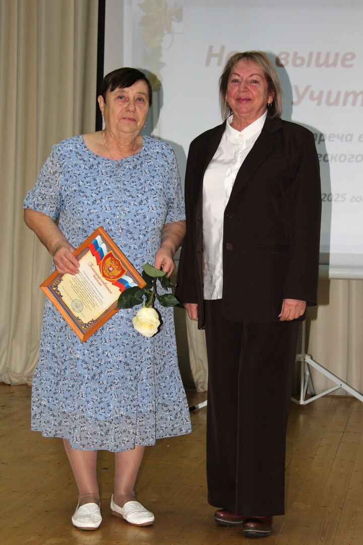 Церемонию награждения продолжила начальник отдела образования Абатского муниципального округа Валентина Шагаева. Благодарственное письмо департамента образования и науки Тюменской области за 45-летний педагогический стаж и в связи с 75-летием со дня рождения получила Валентина Евгеньевна Шалатова, ветеран Абатской СОШ № 1. Благодарности отдела образования администрации Абатского муниципального района за активную жизненную позицию, участие в волонтёрском движении по оказанию помощи и поддержки участников СВО вручены Екатерине Фёдоровне Быструшкиной, ветерану Шевыринской школы; Ольге Юрьевне Коноваловой, ветерану Конёвской школы; Нелли Александровне Склюевой, ветерану отдела образования.