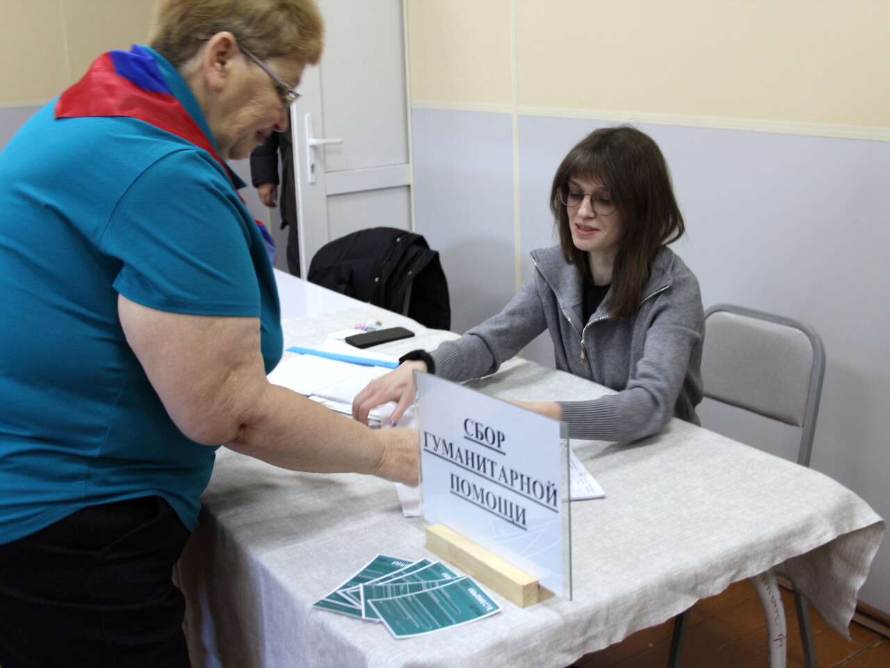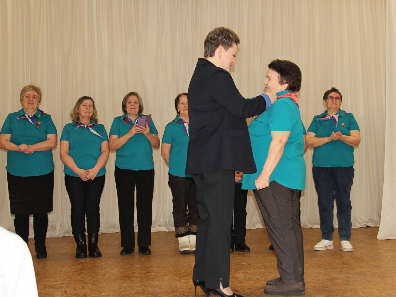 Объединяясь и помогая фронту, мы с вами сегодня делаем тоже великое дело, внося свой вклад в победу. Присоединяются к гуманитарной миссии не только граждане, присоединяются и общественные организации. Я не только заместитель главы Абатского муниципального, а ещё и руководитель Абатского отделения Союза женщин России. И в рамках проекта "Свои для своих", который реализуется с 2025 года, мы поддерживаем самых активных граждан, которые активно участвуют в волонтёрской деятельности. Поэтому позвольте мне вручить членам вашей команды отличительный знак волонтёра.
