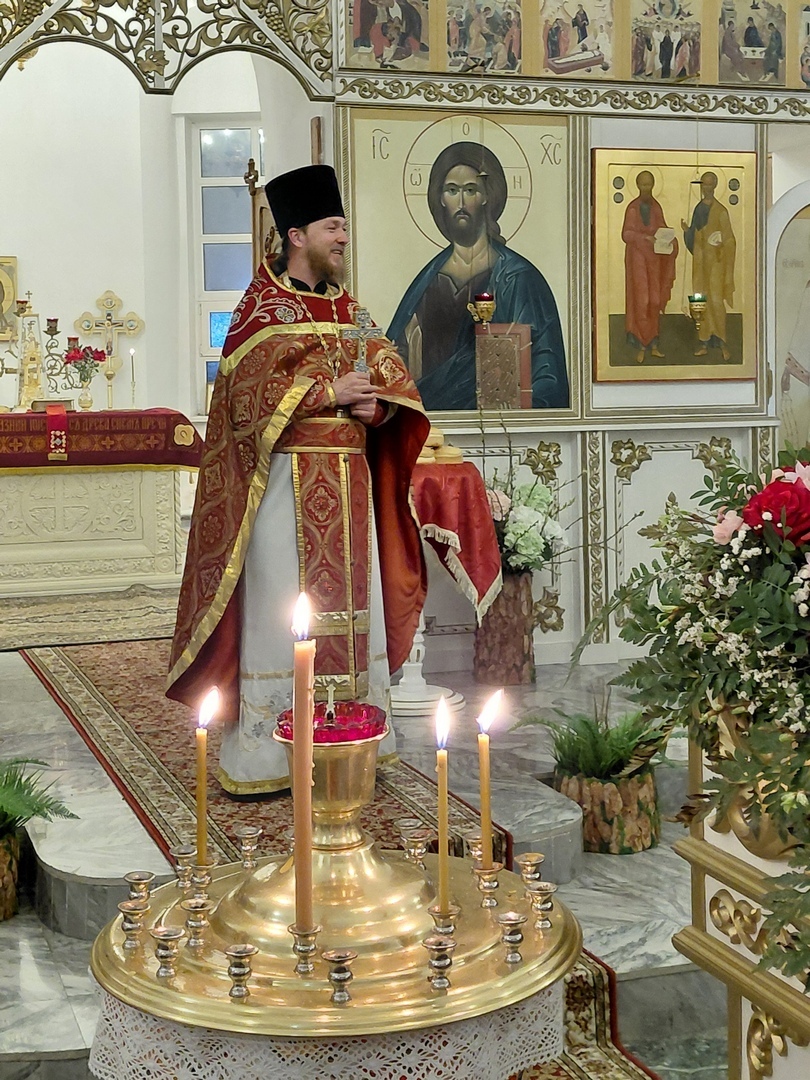 Начало праздничной стихиры "Воскресение Твое, Христе Спасе, Ангели поют на небесех, и нас на земли сподоби чистым сердцем Тебе славити" произнёс в алтаре настоятель иерей Дмитрий Ядыкин, возложив Плащаницу (украшенный вышитый плат с изображением Христа во гробе) на святой Престол.
